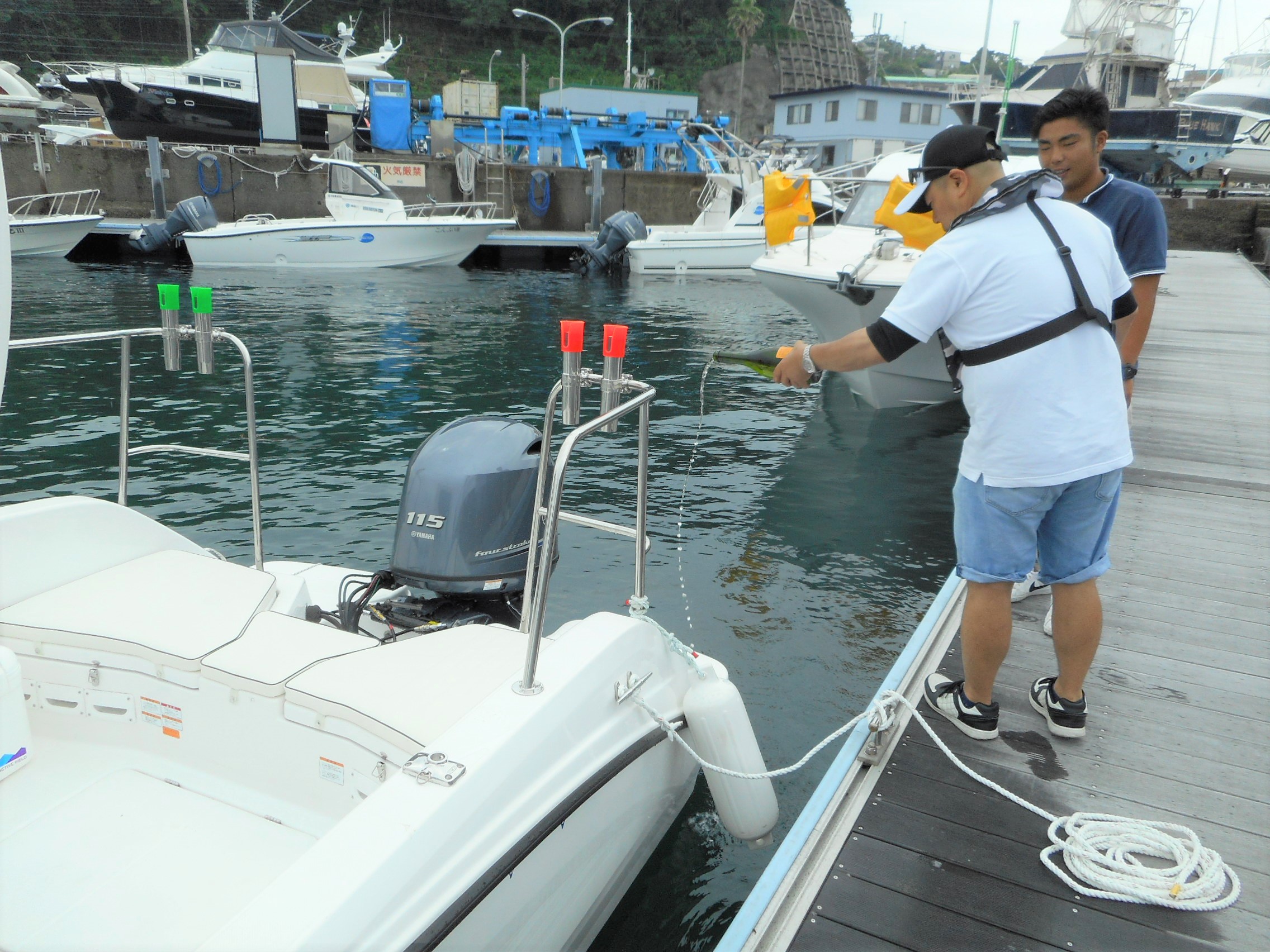 船首と船尾にシャンパンをかけ、安全な航海と大漁を祈念します。