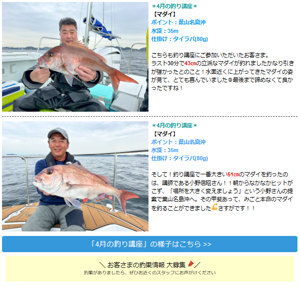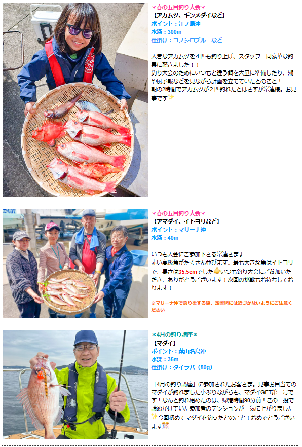 皆さまこんにちは ☆*゚ ゜゚*☆ 最新の釣果情報をお届けいたします ☆*゚ ゜゚*☆ 超高級魚が盛りだくさん!! 「4月の釣り講座」や「春の五目釣り大会」で素晴らしい釣果がたくさん上がりました👏