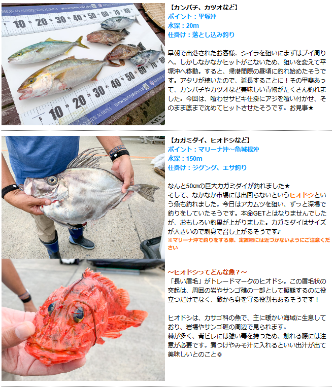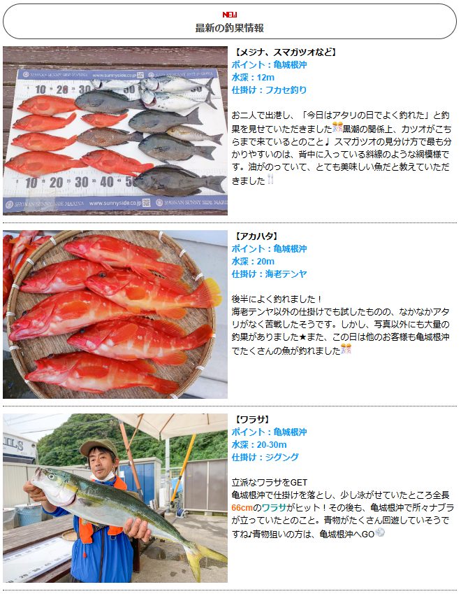 皆さまこんにちは ☆*゚ ゜゚*☆ 最新の釣果情報をお届けいたします ☆*゚ ゜゚*☆ 亀城根沖が絶好調! ワラサやカンパチなど、旬の青物が釣れています🔥