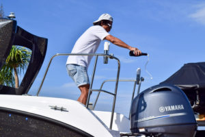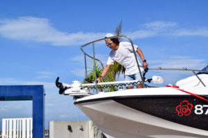 同じ種類の船がレンタルボートにもあり、フィッシングをアクティブに楽しめるトータルパフォーマンスの高さから、利用者にとても人気です。今回の船は、船体の黒いラインにラメをカスタムしており、太陽の光を浴びて綺麗に輝きます。