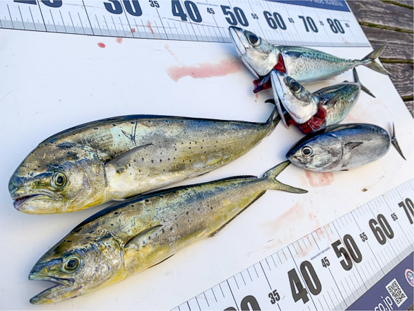 講師の椙尾さんが浮遊物や潮目を探すものの、なかなか見つからず…。終了まで残り1時間というところで、ついに鳥山を発見!鳥の動きを追いながら、何度も仕掛けを投げ入れた結果、シイラを2尾GETすることに成功しました!サイズはやや小ぶりでしたが、「引きは強かった!」と釣り上げた方が嬉しそうに話されていました。今回は厳しい釣行となりましたが、帰港後には椙尾さんによる座学も行われ、学びの多い釣り講座となったのではないでしょうか♪