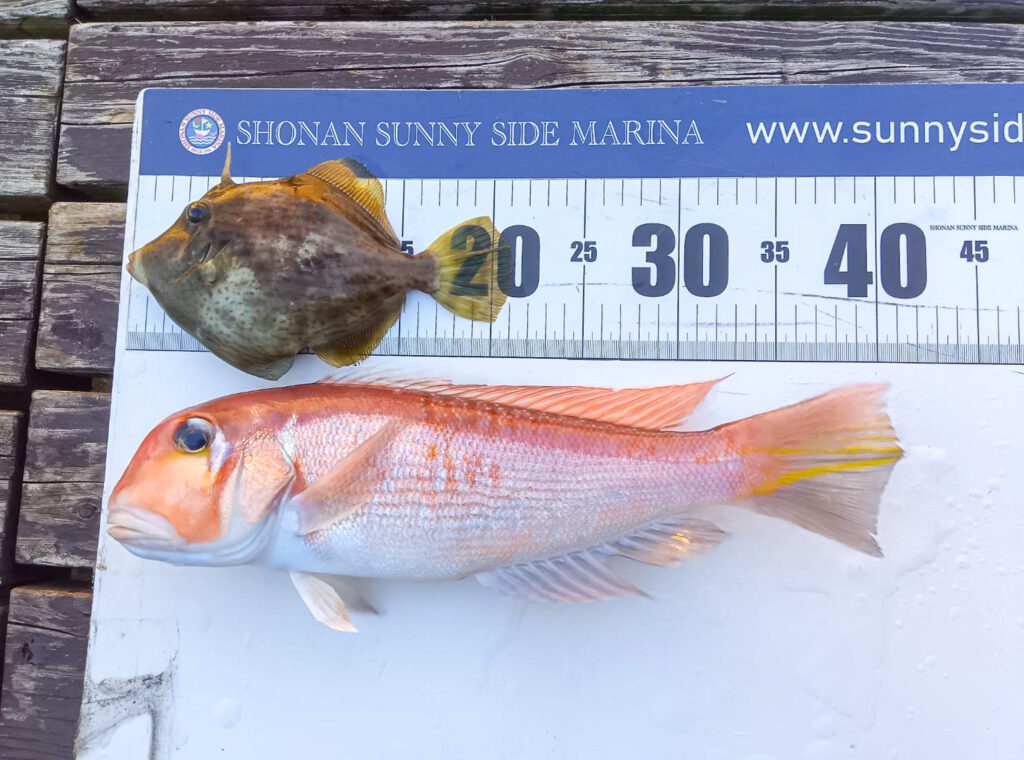 良型のアマダイとカワハギをGET!例年この時期はアマダイが爆釣しますが、今年はややゆっくりとしたスタートのようです。青物の釣果が好調なこともあり、まだアマダイ狙いの方が少ない印象です。もう少し季節が進めば、大型のアマダイやシロアマダイが期待できそうな予感…!