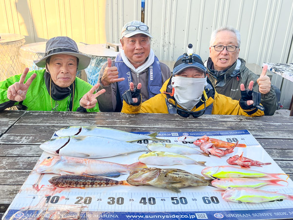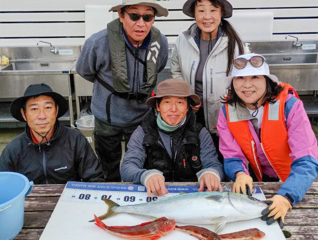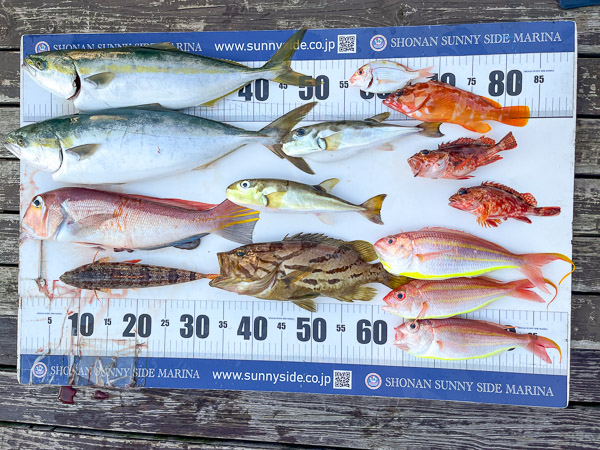 アマダイをはじめ、イナダ、ホウキハタ、カサゴ、レンコダイなど、多彩な魚を次々とキャッチ!帰港後には釣れた魚を綺麗に並べて記念撮影を行い、まるで魚図鑑のような豪華なラインナップになりました。青物から根魚まで、彩り豊かな大満足の釣果でした。