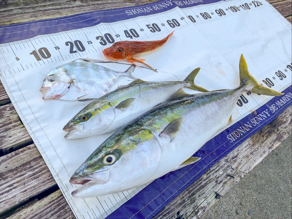 青物も引き続き好調です!まずは江の島沖で高級魚トラフグを狙ったものの、このポイントではホウボウのみの釣果に。その後、亀城根沖へ移動し水深約90mのポイントで、ほぼブリサイズのワラサを見事キャッチされました。さらに長者ヶ崎沖ではサゴシもヒット!今シーズンのワラサは脂がよく乗っており、きっと格別な味わいだったことでしょう♪