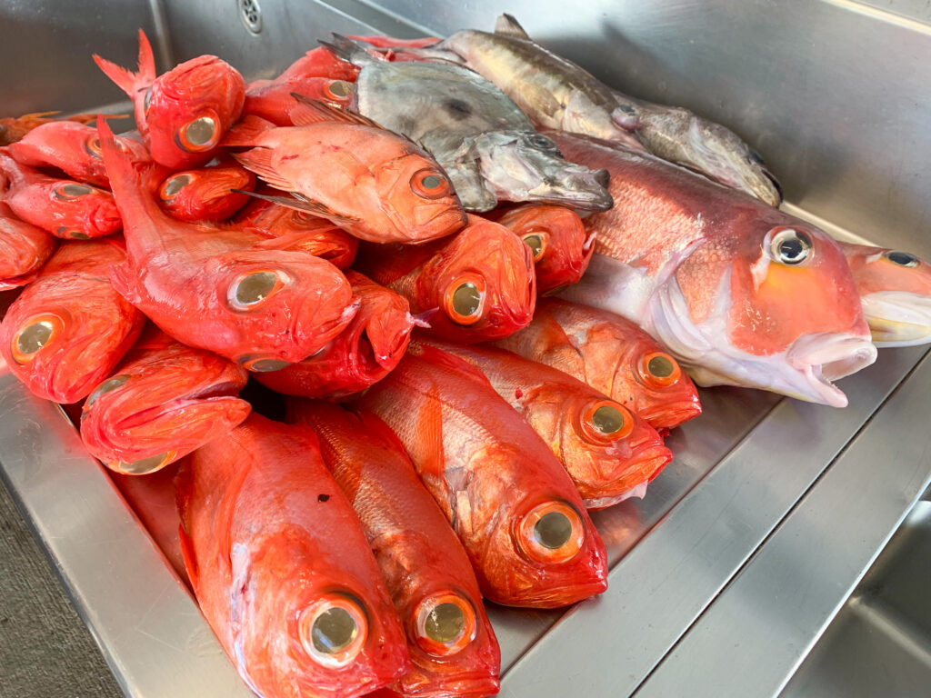 いつも大島沖でキンメダイ釣りを楽しまれているオーナー艇。年末には城ヶ島沖で、なんと大漁のキンメダイをゲットされました!あまりの数に、捌くのも一苦労だったご様子でした(笑)。年末にふさわしい見事な釣果、誠におめでとうございます。