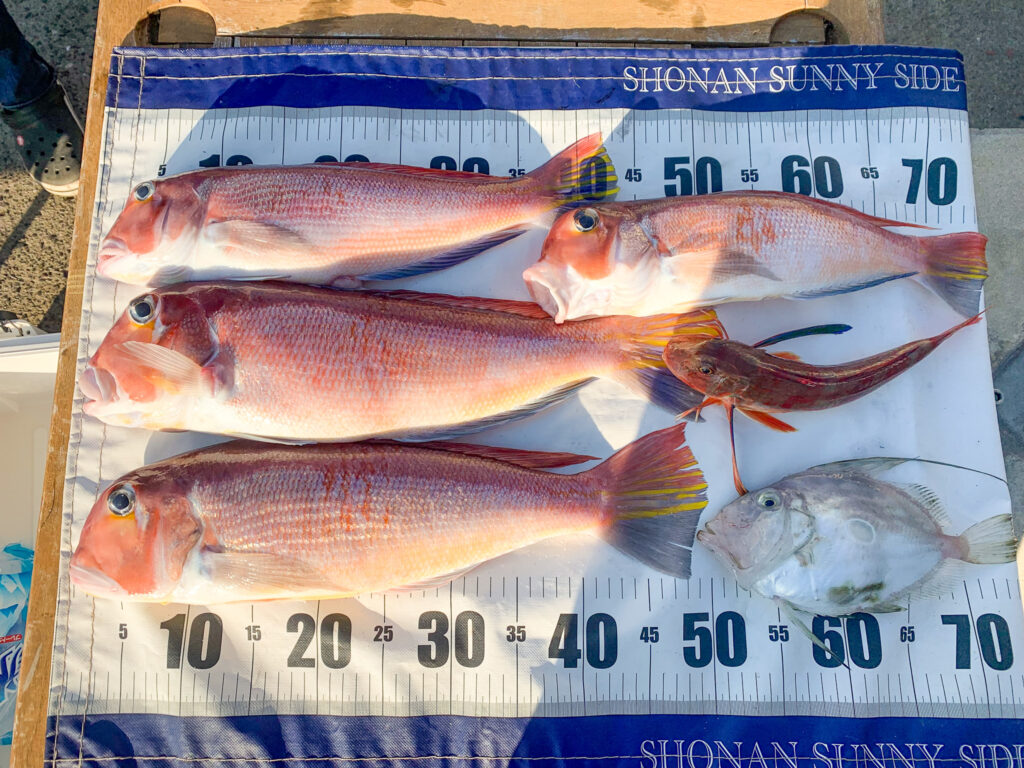 今回はアマダイの釣果が盛りだくさんです!こちらは電動リールでの釣行だったため、引きはあまり感じなかったそうですが、50cmオーバーのアマダイを釣り上げ、とても喜ばれていました。昨年も同じ仕掛けでアマダイを釣り上げたそうで、アタリの良い仕掛けだったようです◎