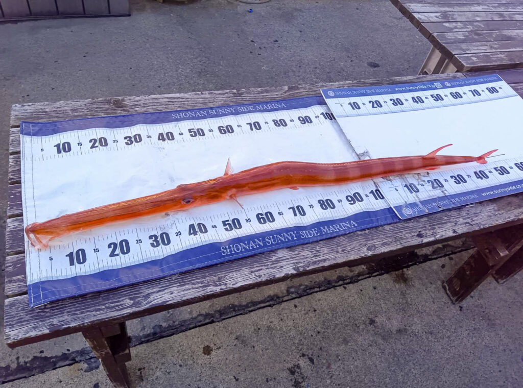 なんと、全長1m45cmの巨大ヤガラが釣れました!!胴体も丸々と太っており、このサイズはなかなかお目にかかれないため、写真を撮らせていただきました。ヤガラは刺身や唐揚げはもちろん、この時期は鍋料理にしても絶品です。