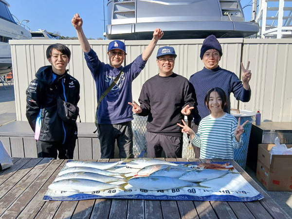 亀城根沖でナブラを発見し、ナブラ打ちに挑戦。見事、大漁のイナダを釣り上げることができました。約30分という短時間で数多くの釣果を上げられたそうです。帰港後は、釣れた魚とガッツポーズで記念撮影!おめでとうございます。