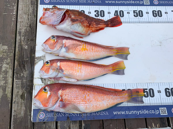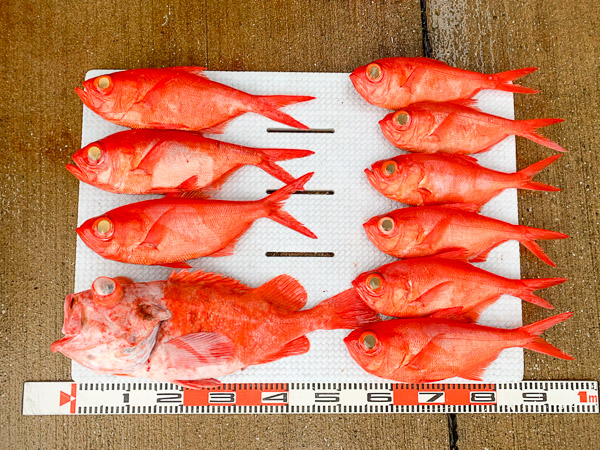 こちらは、キンメダイ釣りが得意なオーナー様。今回は千葉方面へ出港され(場所はざっくりですが…笑)、立派なキンメダイに加え、2.56kgの大型アコウダイも見事に釣り上げられました。キンメダイの最大サイズは1.2kg。今回もお見事な釣果でした。