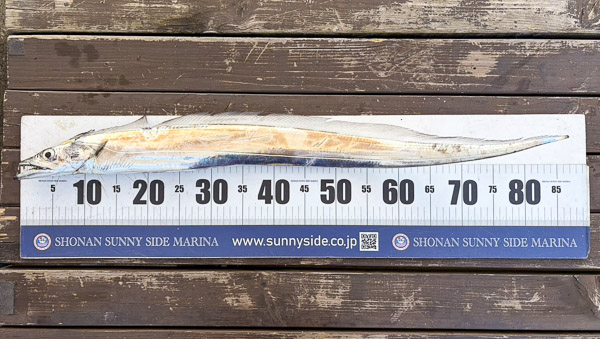 前日に「タチウオが浅場に上がってきている」という乗合船の釣果情報をゲット!その甲斐あって、狙い通り葉山沖で90cm超え・F4サイズのタチウオを釣ることができました。お見事!