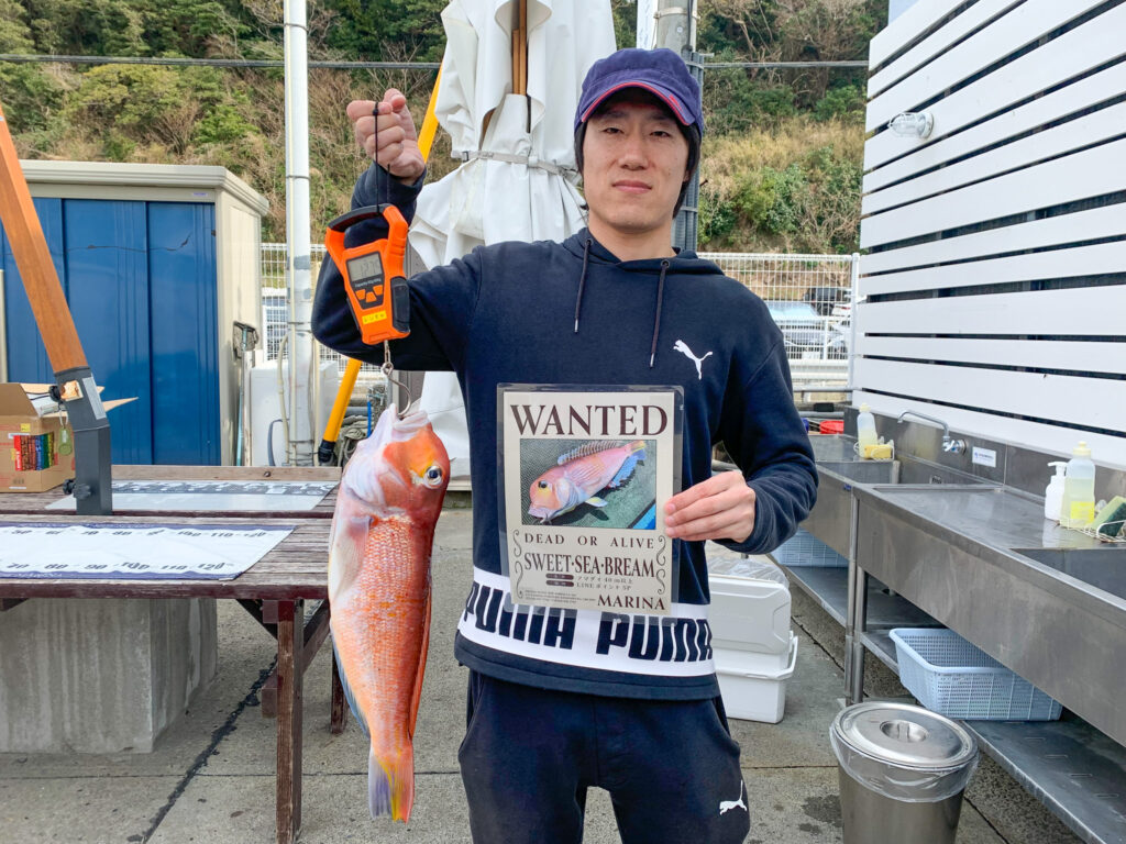 1.275kg・48cmのアマダイを釣り上げ、見事FISH QUESTクリア!朝のうちは浅場で釣りをされていたものの、あまり反応が少なく、途中で深場へ移動。風が落ち着いてきたタイミングでアマダイのアタリが増え、好釣果につながったそうです。QUESTクリアおめでとうございます!