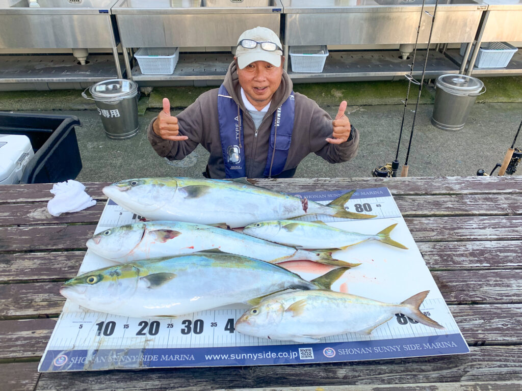 早朝に出港されたお客様。10時頃までにたくさん釣れたそうです。毎年、この時期は深場でブリが上がるため、今回はお一人でブリを狙い出港。亀城根沖で潮が流れていそうな地形を見つけ、そこでじっくりと粘ったとのこと。翌日はご友人と“ブリパーティー”を開催予定とのことで、釣り上げた新鮮なブリをも持っていくそうです。素敵ですね♪