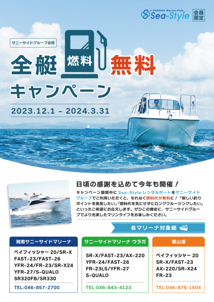 キャンペーン期間中にSea-Styleレンタルボートをサニーサイドグループでご利用いただくと、もれなく燃料代が無料になります。「新しい釣りポイントを発見したい!」「燃料代を気にせずロングクルージングを楽しみたい!」といったご希望にお応えします🔥