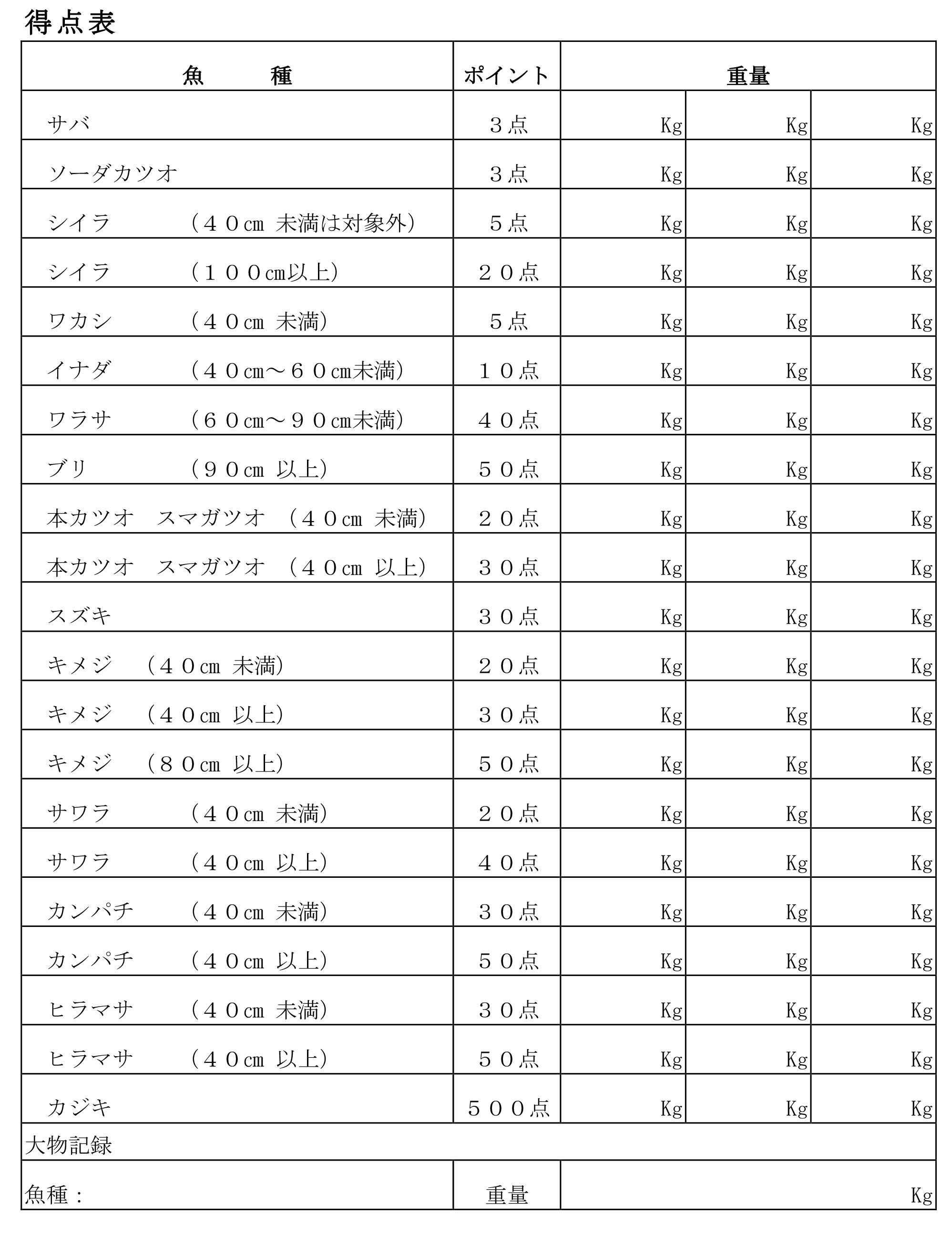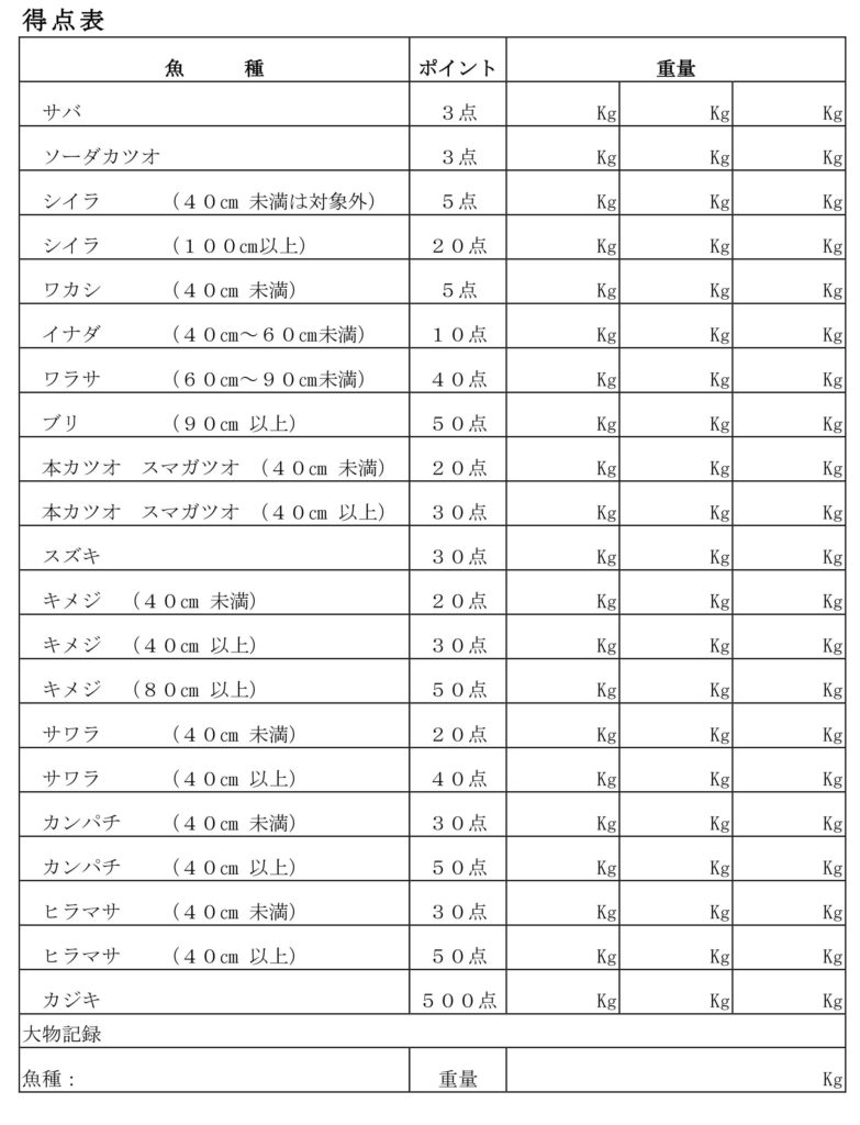 指定の魚種で1魚種ごと3匹までの合計量×ポイント(別紙参照)で採点します。