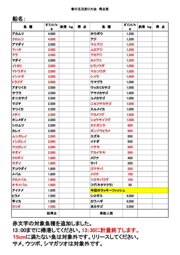 魚種別のポイント×重量(Kg)÷乗船人数を