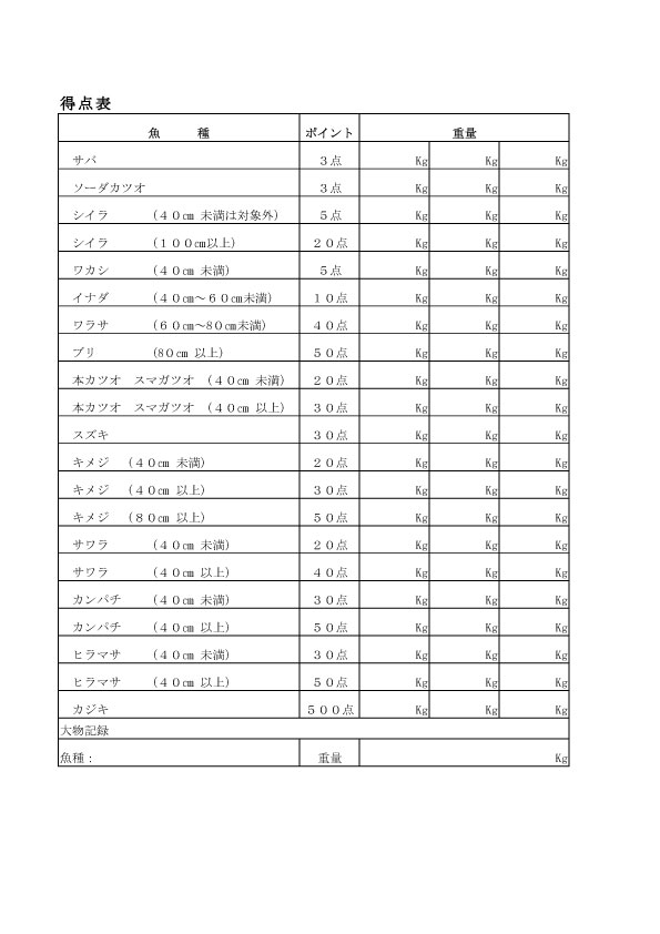 ※ポイントは得点表をご覧ください(表に記載のない魚は採点の対象外)
