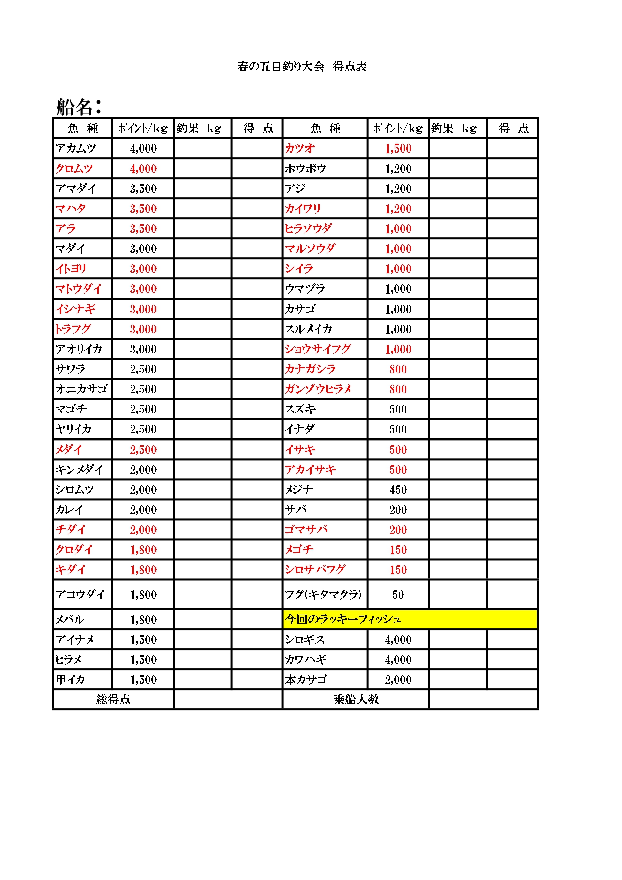 魚種別のポイント×重量(Kg)÷乗船人数を