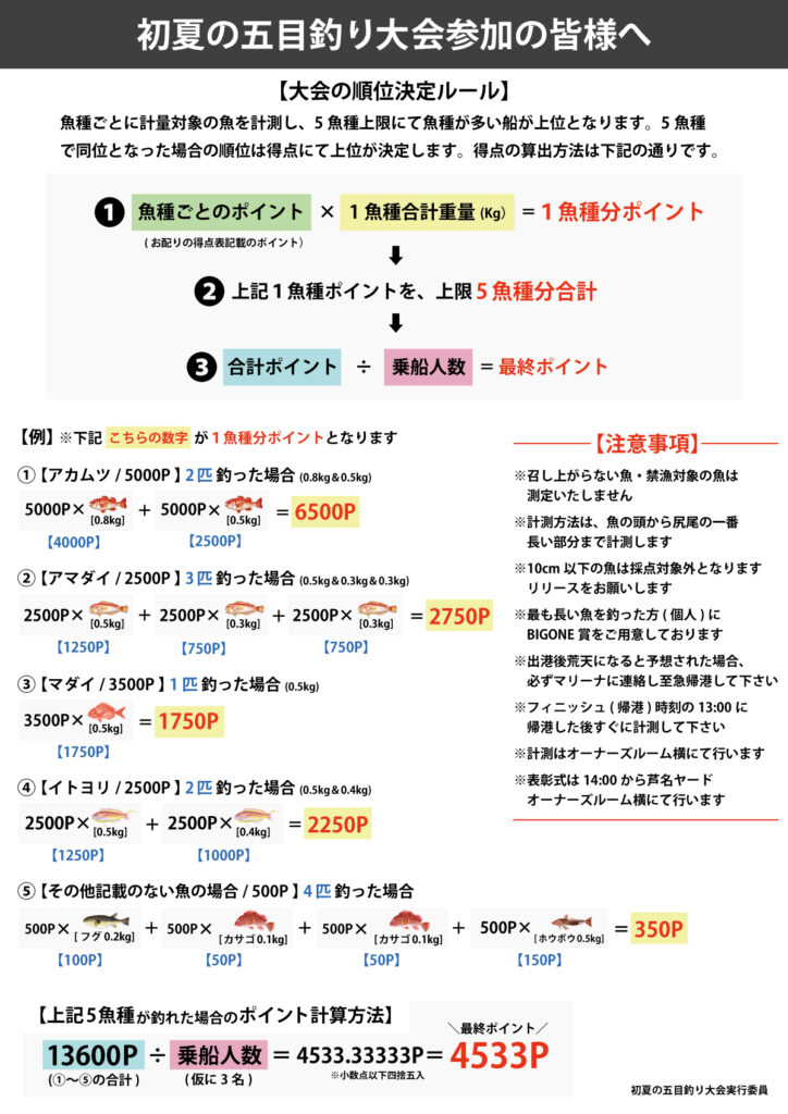 ※上記(1魚種ポイント)を上限5魚種分合計したポイント÷乗船人数=最終ポイント