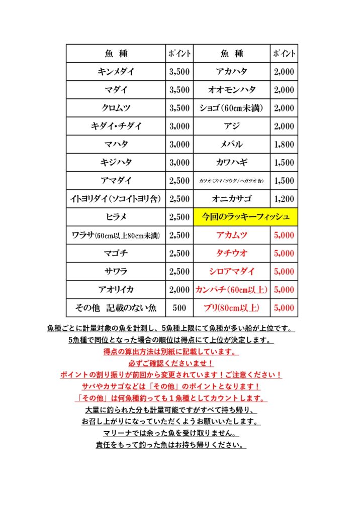 魚種ごとに計量対象の魚を計測し、5魚種上限にて魚種が多い船が上位となります。5魚種で同位となった場合の順位は得点にて上位が決定します。得点の算出方法は下記の通りです。