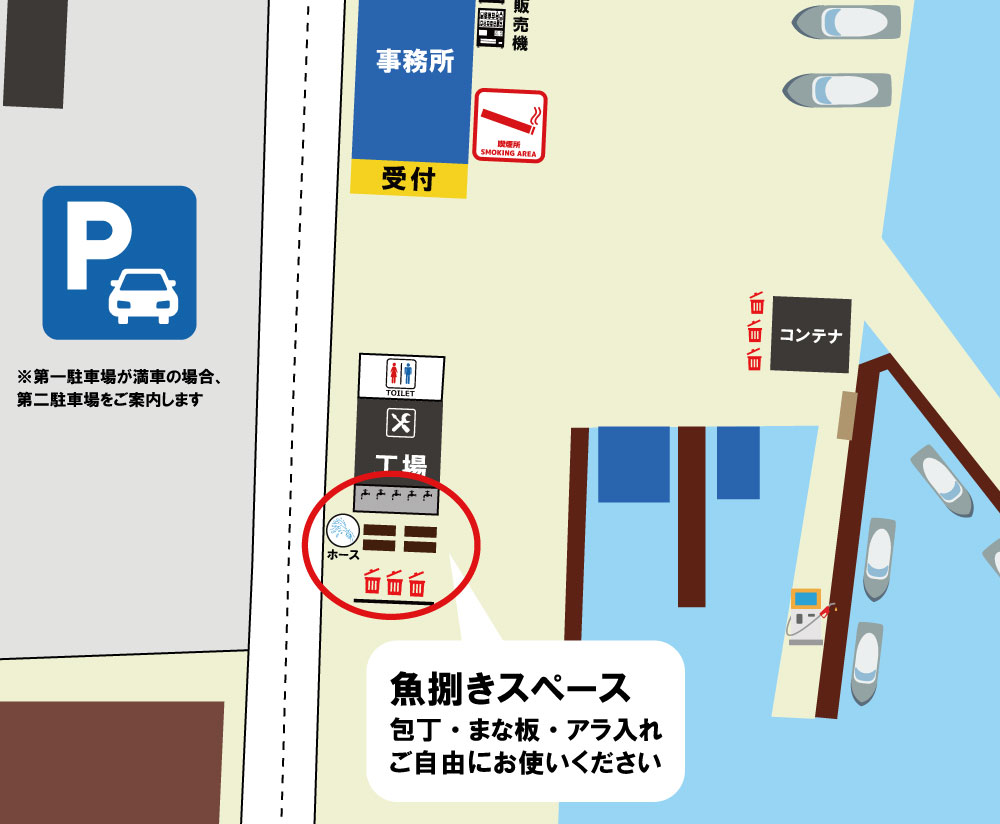 また今まで同様、包丁やまな板、魚を測るスケールなどもご自由にお使いいただけます。