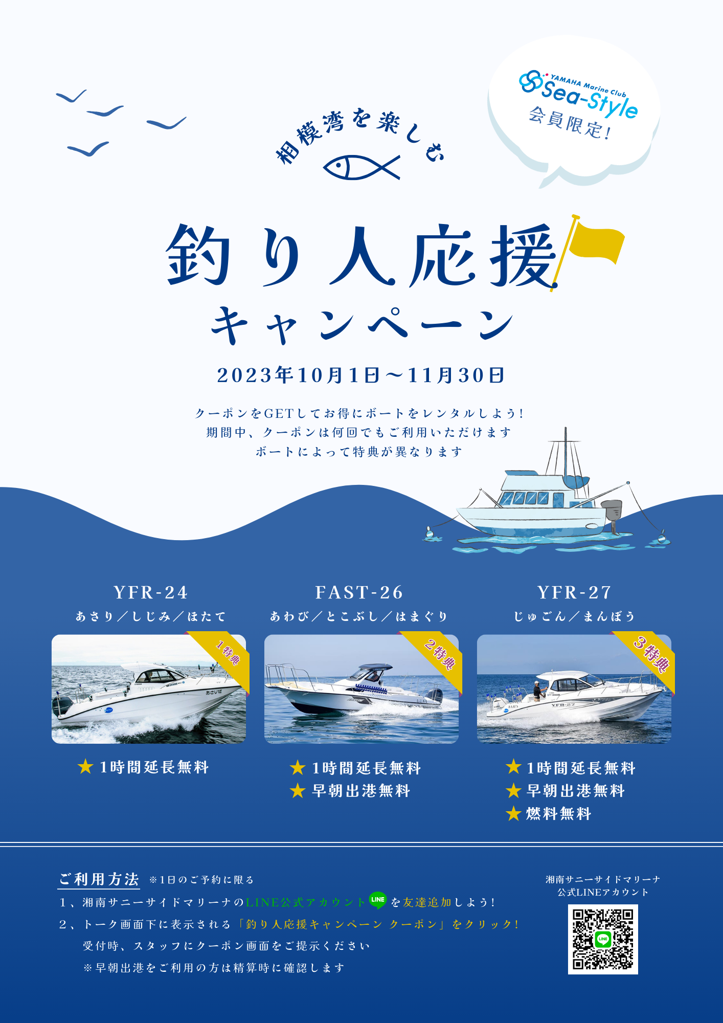 期間中、対象艇のご利用につきお得な特典が受けられます。