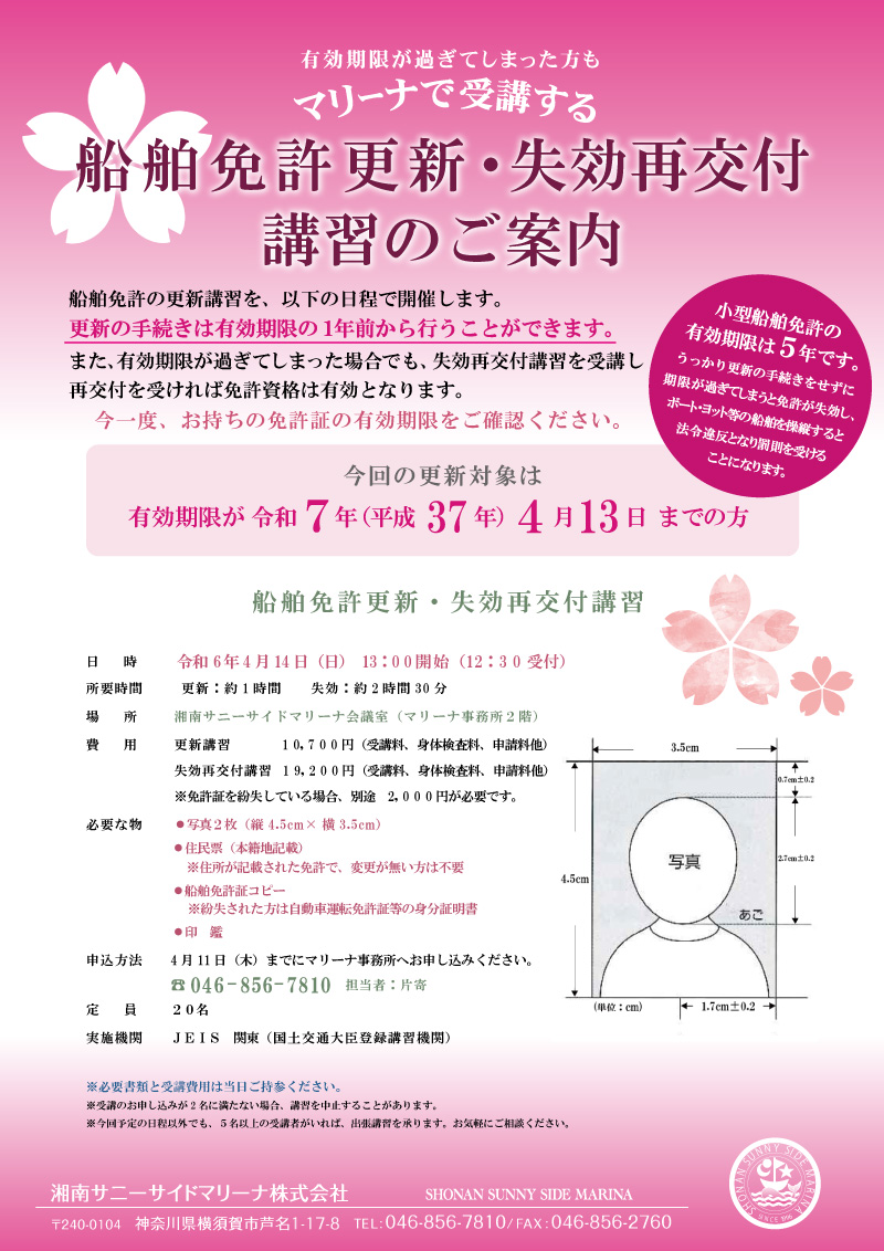 4月14日(日)に湘南サニーサイドマリーナにて、船舶免許更新・失効再交付講習】を実施いたします。更新の手続きは有効期限の1年前から行うことができます。また、有効期限が過ぎてしまった場合でも、失効再交付講習を受講し再交付を受ければ免許資格は有効となります。今一度、お持ちの免許証の有効期限をご確認ください。