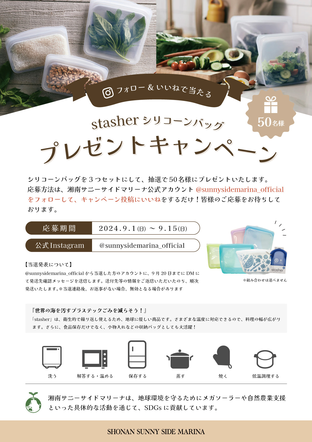 9月1日から15日までの期間、湘南サニーサイドマリーナのInstagram公式アカウント(@sunnysidemarina_official)で『stasher シリコーンバッグ プレゼントキャンペーン』を実施します!