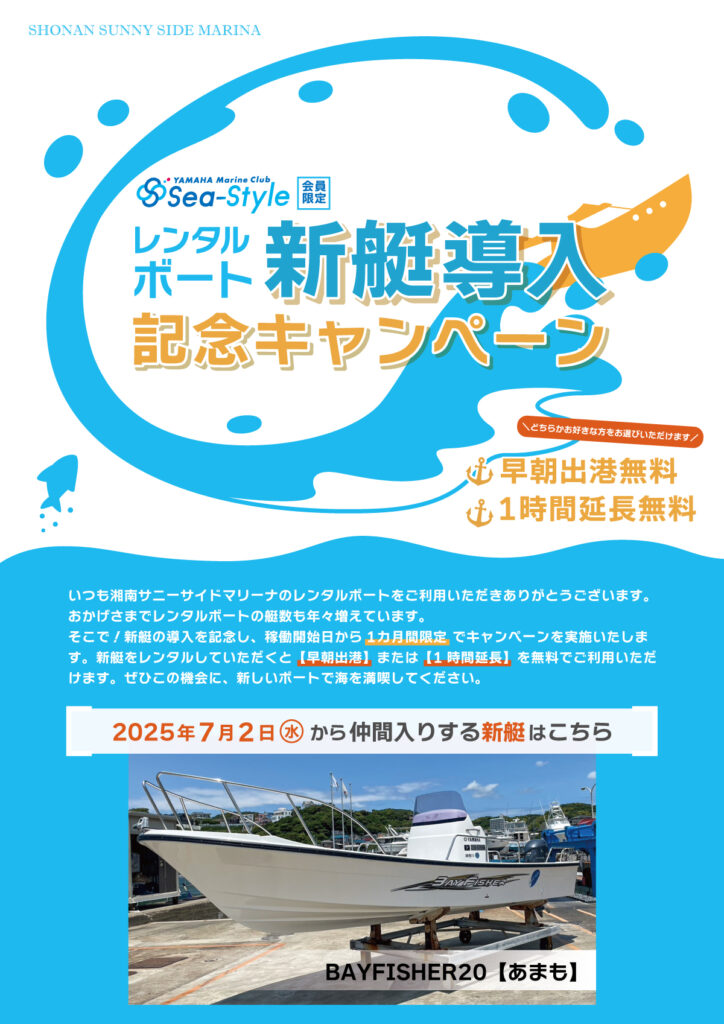 新艇の導入を記念し、稼働開始日から1カ月間限定でキャンペーンを実施いたします。新艇をレンタルしていただくと【早朝出港】または【1時間延長】を無料でご利用いただけます!