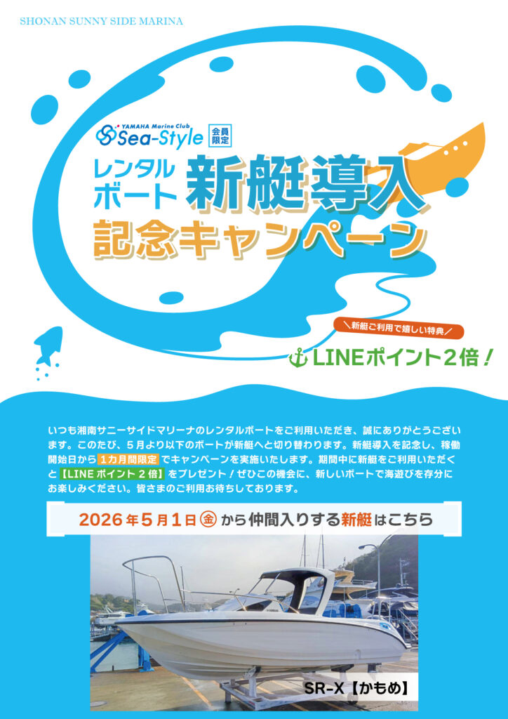 新艇導入を記念し、稼働開始日から1カ月間限定でキャンペーンを実施いたします。5月1日~31日までの期間中、新艇をご利用いただいた方には、【LINEポイント2倍】をプレゼントします。