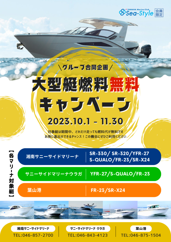 2023年10月1日~11月30日 までの期間限定で大型艇燃料無料キャンペーンを実施します。