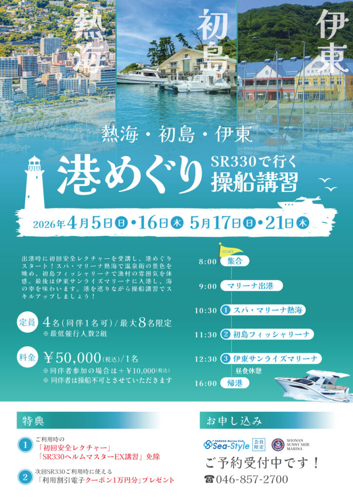 大型艇の操船スキルを磨きながら、相模湾の港を巡る特別なトレーニング【SR330港めぐり講習】。初回安全レクチャーから実践的な操船講習を経て、熱海・初島・伊東までの長距離航行に挑戦します⚓