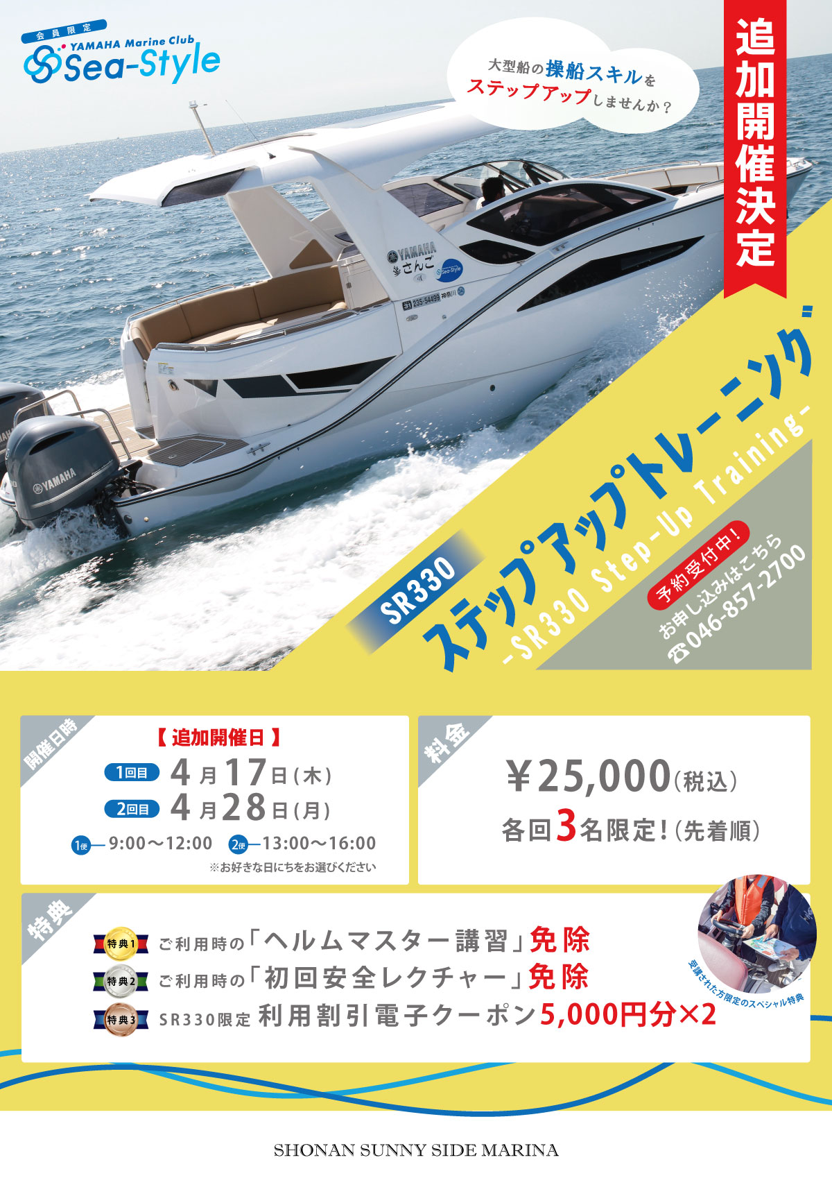 今回のトレーニングでは、SR330を使用し、安全でスムーズな操船技術を学びながら、より快適なクルージングを目指します。