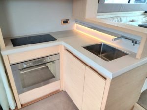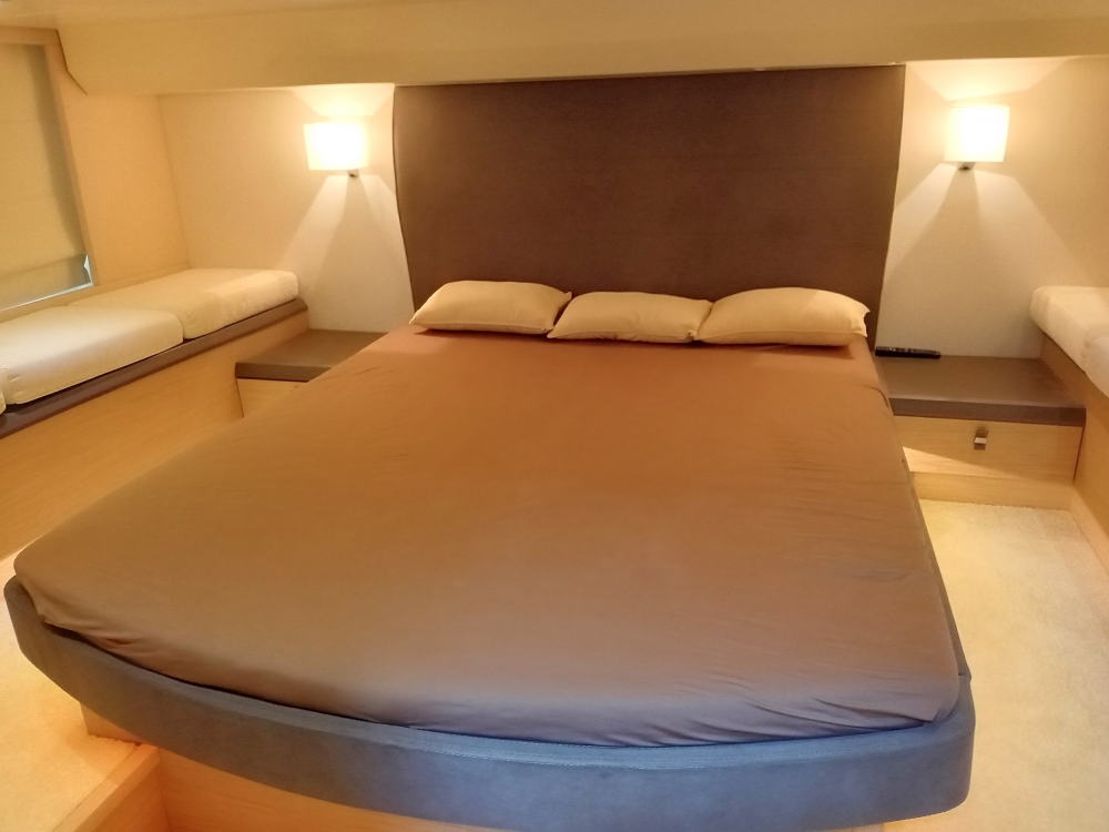 モダン・スタイリッシュなイタリアンデザインボート。フルビームマスターステートルーム、共有トイレ付のゲストキャビンが2つあります。Color:ターコイズブルー