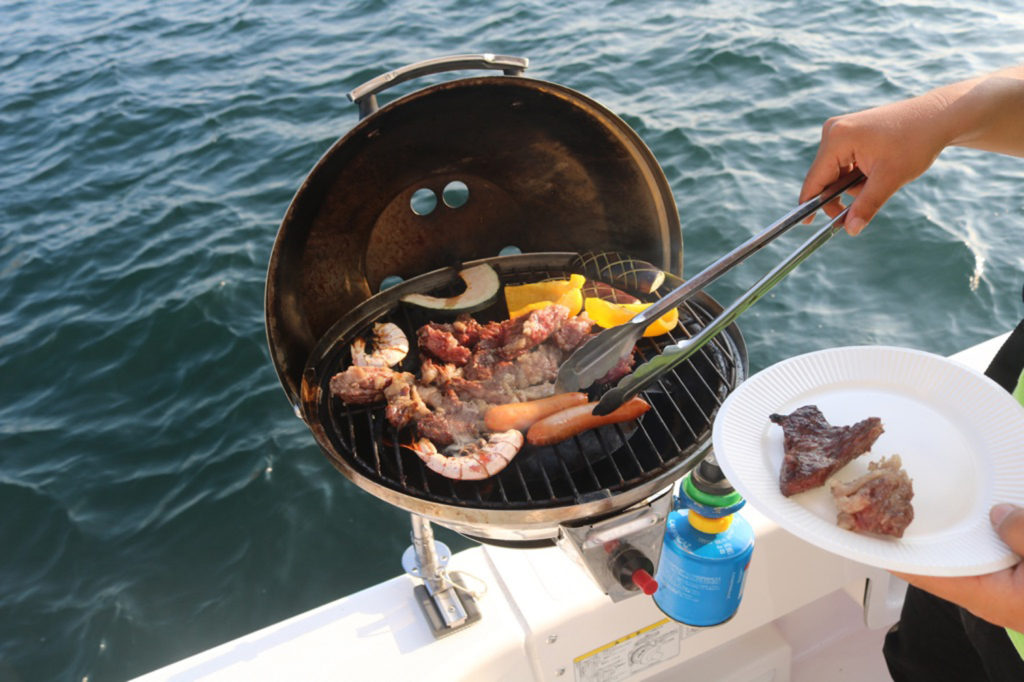 BBQコンロを設置できる船なら、船上でBBQを楽しめます。レンタルボートでは、対象艇に限りBBQコンロの貸出しを行っています。