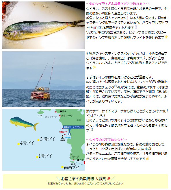 江ノ島沖でシイラの大群を発見!メーター越えとはいきませんでしたが、シイラ9匹とカツオを釣り上げました✨!今年は10月に入っても日中は気温が高いため、まだまだシイラは狙えるだろうとのこと。今回はシイラがたくさん釣れましたが、本命はマグロだったそうです。!次回の挑戦も楽しみにしています♪