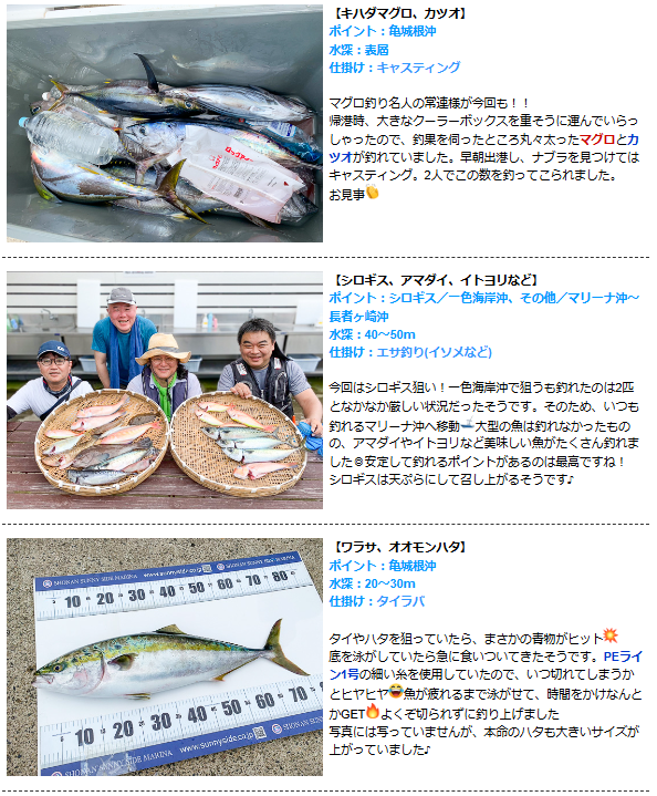今回ヒットさせたのは息子さん。仕掛けを回収しているときに食いついてきたそうです。強烈な引きに耐え、ラインを切られることなく見事キャッチ成功★最初は亀城根方面を攻めたもののアタリはなく、江の島方面へ移動。そこでナブラとカツオ狙いの遊漁船を発見し、船が去ったあとに同じポイントで粘っていたところ、見事キハダマグロがヒット!素晴らしい釣果となりました♪
