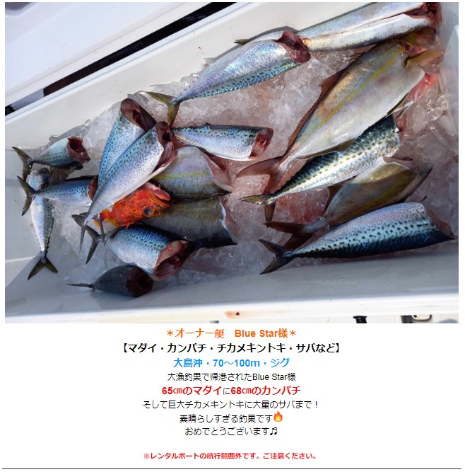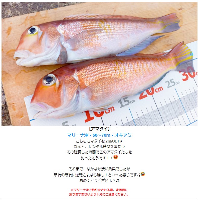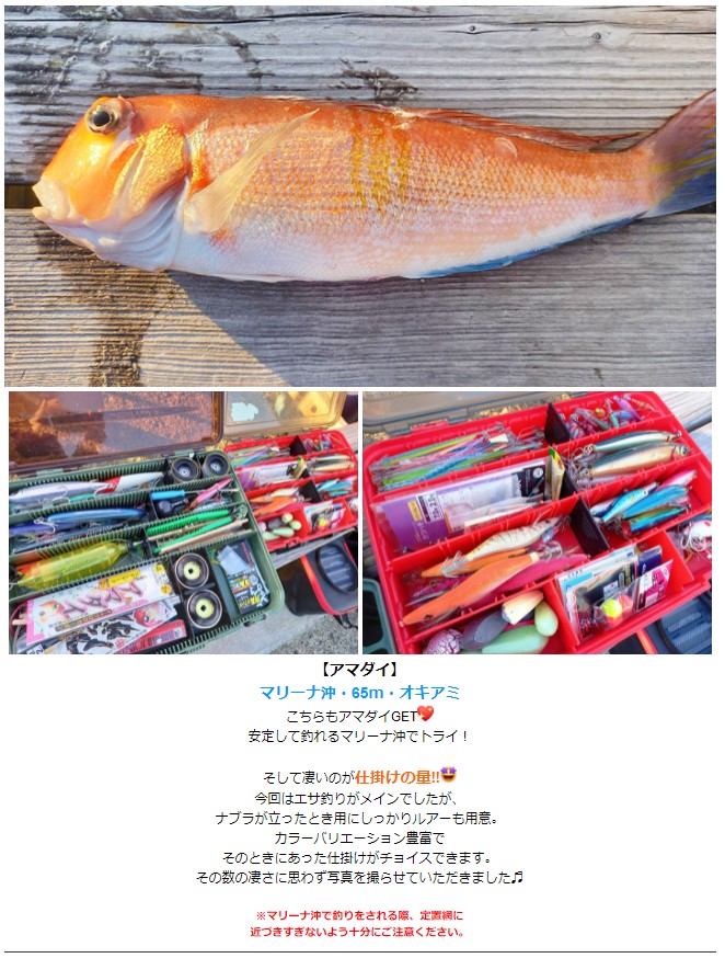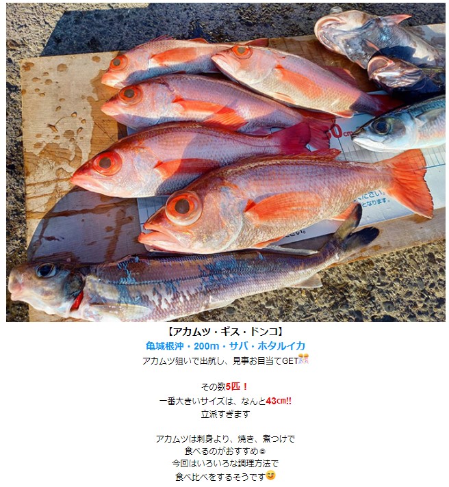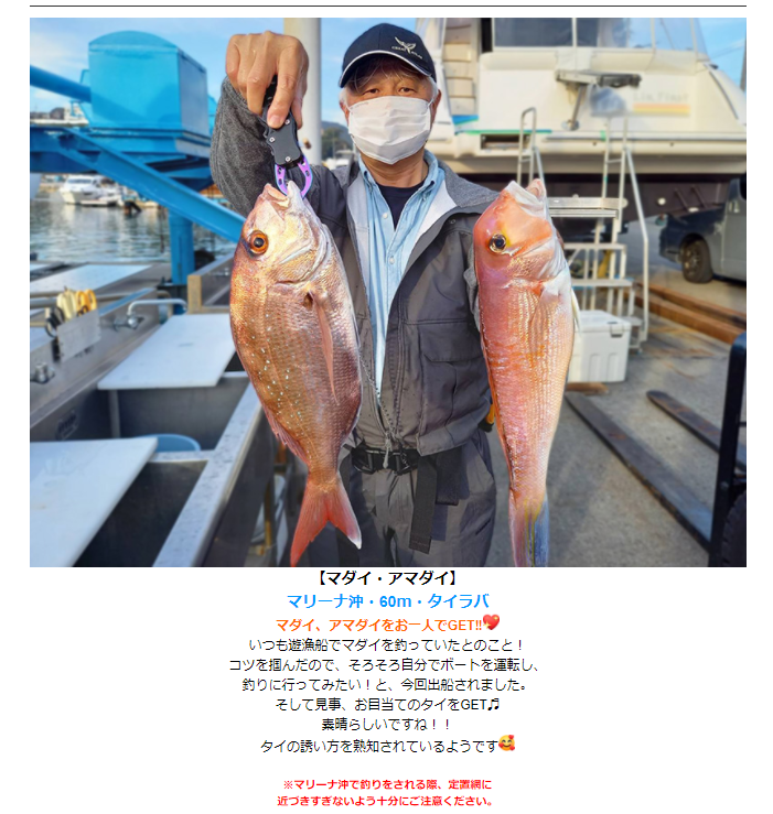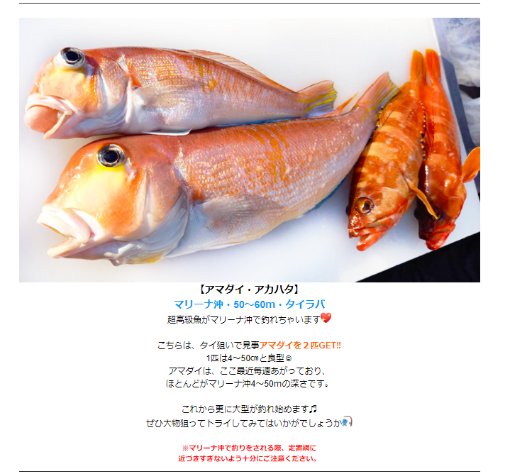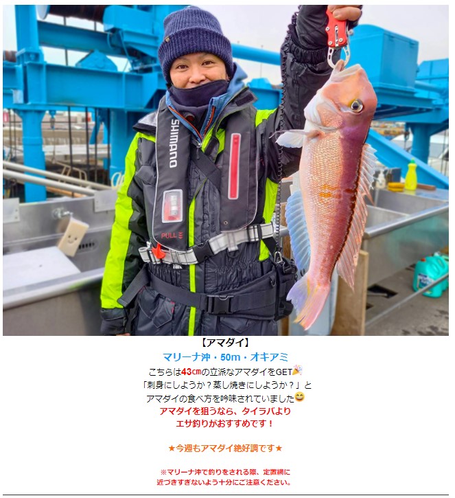 釣果情報/2022年1月 皆さまこんにちは ☆*゚ ゜゚*☆ 最近の釣果情報をお届けいたします ☆*゚ ゜゚*☆ 今週もマダイ、アマダイが絶好調! また、スタッフがおすすめするターゲットの”アカムツ”もよく釣れています⚓ 寒さが厳しい冬場ですが、その分絶品の魚が味わえます♬ 皆さまのお越しをお待ちしております。