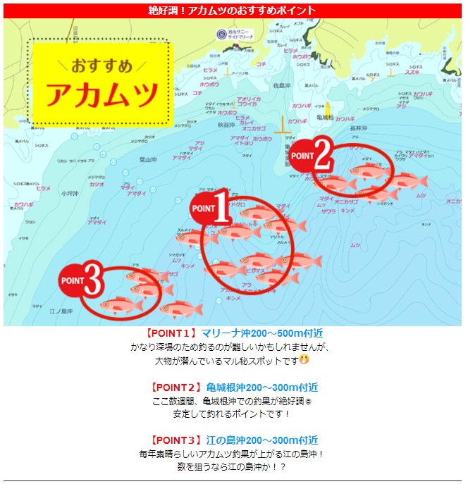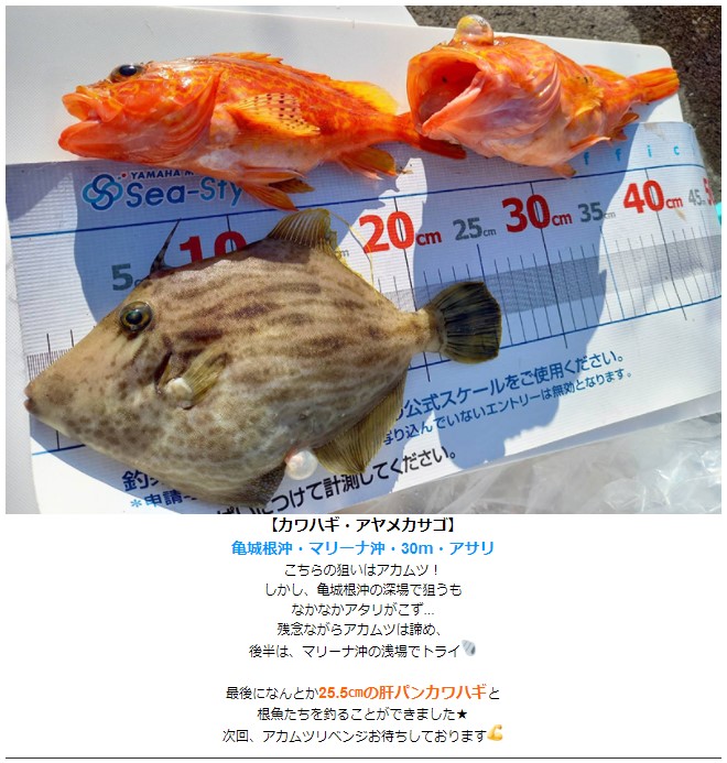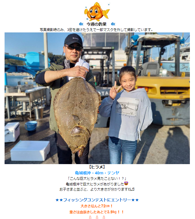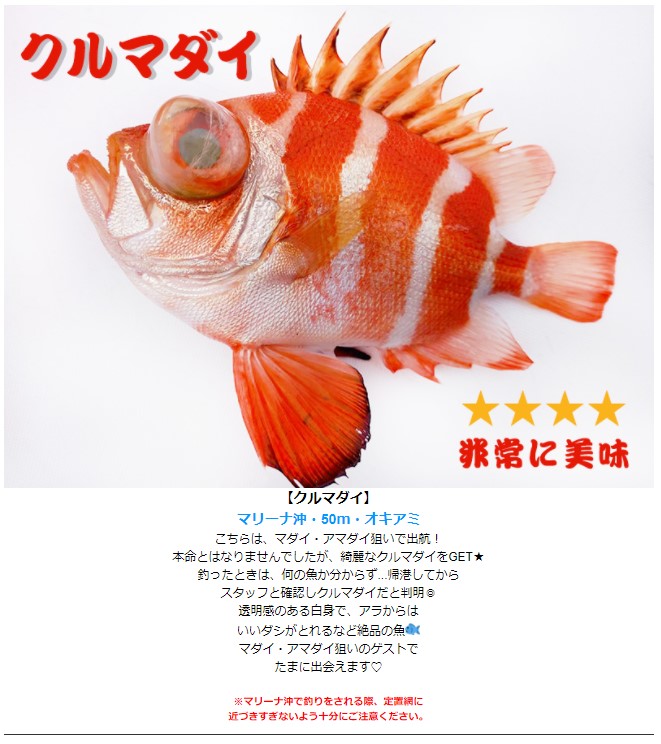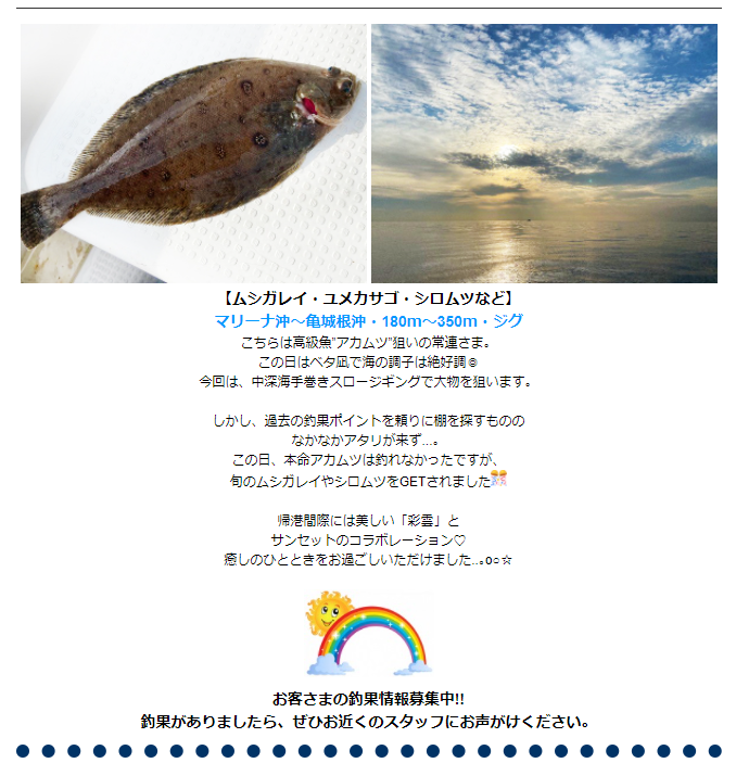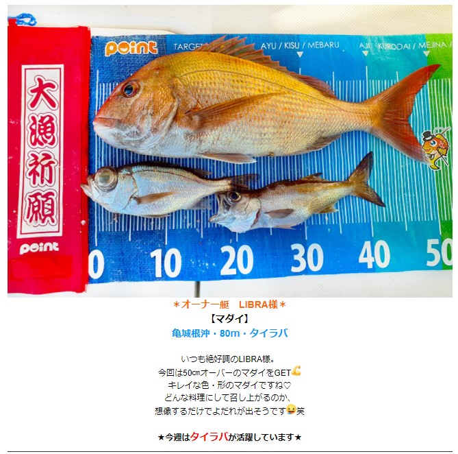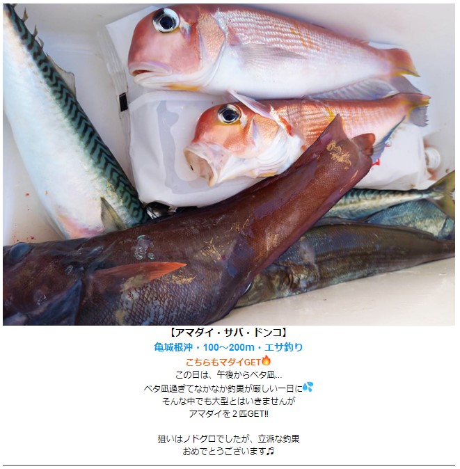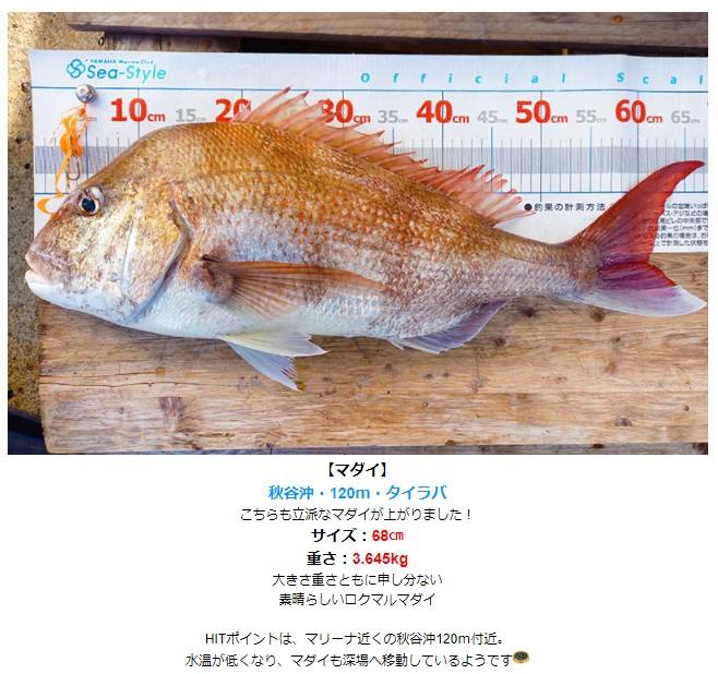 釣果情報/2022年1月 皆さまこんにちは ☆*゚ ゜゚*☆ 最近の釣果情報をお届けいたします ☆*゚ ゜゚*☆ 今週もマダイ、アマダイが絶好調! また、スタッフがおすすめするターゲットの”アカムツ”もよく釣れています⚓ 寒さが厳しい冬場ですが、その分絶品の魚が味わえます♬ 皆さまのお越しをお待ちしております。